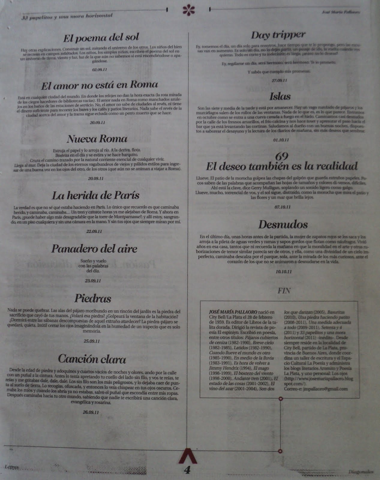 El libro “33 papelitos y una mora horizontal” se publicó en el suplemento Letras, nº 12, del diario Diagonales de La Plata, el sábado 26 de noviembre de 2011.